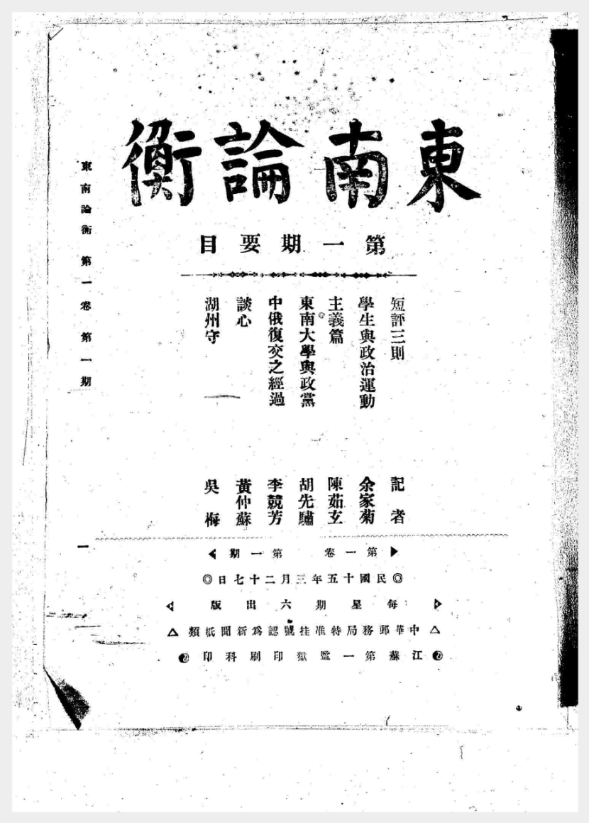 《东南论衡》,1926年3月27日创刊,东南论衡社出版,1927年1月停刊。