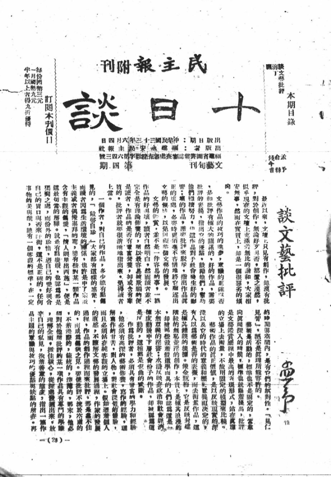 《十日谈》,创刊于1944年,由海岑、孟予担任主要责任者,福建永安民主报社负责出版。该刊最初作为《民主报》的附刊发行,以旬刊形式面世,后调整为月刊。