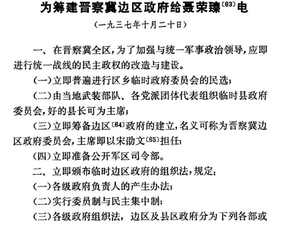 刘少奇《为筹建晋察冀边区政府给聂荣臻电》,选自抗战文献数据平台所录《刘少奇选集》上卷。