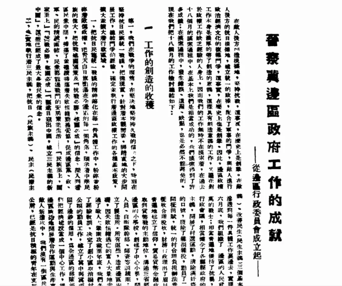 《解放》1939年第91、92期合刊刊发社论《晋察冀边区政府工作的成就》,选自抗战文献数据平台。