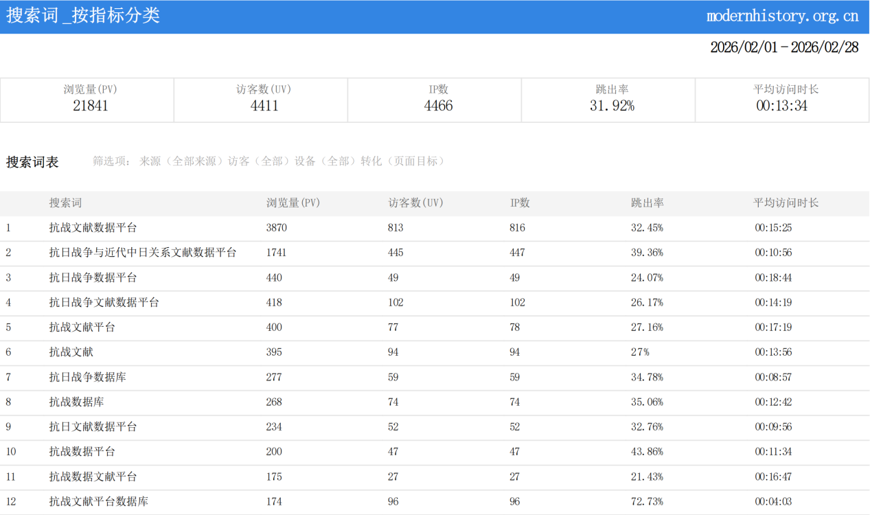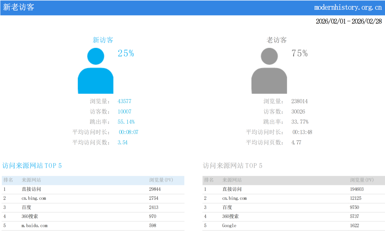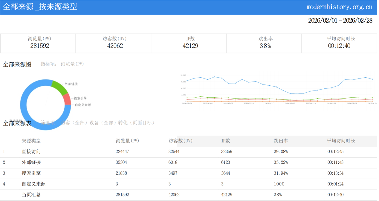 据百度统计,2026年2月1日至2月28日,平台总访问量约28.1万次,访客人数约4.2万,其中新访客占25%。绝大部分用户通过域名(www.modernhistory.org.cn)直接访问平台。