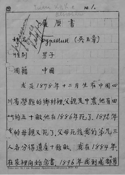 第二类文献是俄罗斯国家社会政治历史档案馆保存的中共领袖个人档案,涉及陈独秀、李大钊、罗亦农、周恩来、林伯渠、徐特立、赵世炎、陈潭秋、王明、杨尚昆、毛泽民、沈泽民、瞿秋白、杨之华等数百位中共领袖。每人档案中大致包括个人简历、自传、调查统计表、党费缴纳表、照片等。例如吴玉章档案中就有其亲笔撰写的两份自传和履历书、护照原件、个人照片(图1、2);张闻天档案中有他亲笔撰写的90余页反省笔记;陆军大学(伏龙芝军事学院)档案中有左权、刘伯承的学习情况和毕业分配方案等。